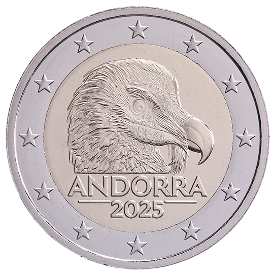Description: To raise awareness about the importance of protecting wildlife and the environment, the design of the coin shows a close-up of a bearded vulture (Gypaetus barbatos), a bird species threatened with extinction, with the inscription “ANDORRA” and the year of issue “2025”. The coin’s outer ring bears the 12 stars of the European flag.