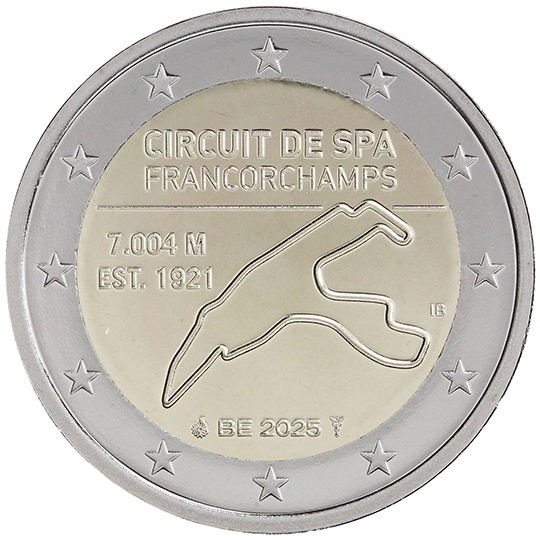 Description: The design depicts in the centre the current track layout of the racing circuit in Spa-Francorchamps. On the left side of the coin, the total distance (in meters) of the circuit, ‘7.004 M’, is displayed and below it also the year of the establishment of the circuit, ‘1921’, is shown. Above the depiction of the track layout, the text ‘CIRCUIT DE SPA FRANCORCHAMPS’ is displayed. On the bottom of the coin, the country code ‘BE’ and the year of issue ‘2025’ are shown, accompanied by the Belgian mint director mintmark, an aster flower in front of an Erlenmeyer flask, and the mintmark of Utrecht, a mercury staff (as the Royal Dutch Mint will strike the coins). At the right side of the coin, the initials ‘IB’ of designer Iris Bruijns are visible. The coin’s outer ring bears the 12 stars of the European flag.