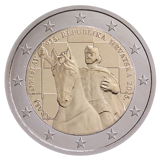 Description: The central motif of the design is King Tomislav on horseback. The other motif is Croatia's distinctive and recognisable symbol, the Croatian checkerboard, which represents part of the coat of arms of the Republic of Croatia. The design also features the following inscriptions: the words "KRALJ TOMISLAV" (King Tomislav), the year of the coronation of King Tomislav "925.", the issuing country "REPUBLIKA HRVATSKA" (Republic of Croatia) and the year of coin issuance "2025.", which are all inscribed circularly along the edge of the coin's core. The national side of the coin is designed by sculptor Nikola Vudrag. The central motif is his adaptation of the original work by sculptor Robert Franges Mihanovic from 1938. The coin’s outer ring bears the 12 stars of the European flag.