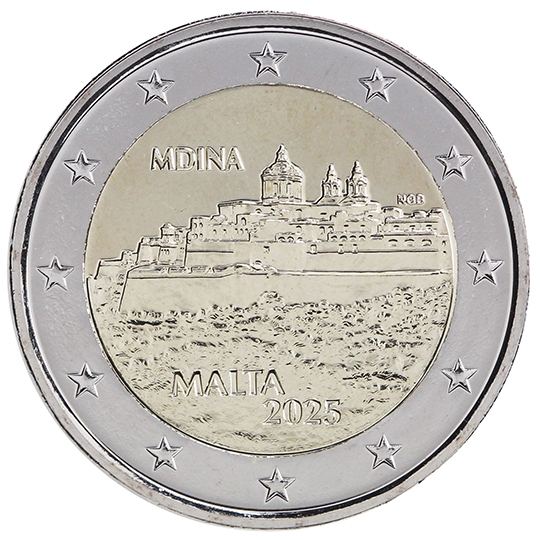 Description: This coin is intended as part of a series dedicated to Maltese walled cities, which are an intrinsic part of Maltese and European cultural heritage. It follows on the coin issued in 2024 depicting “Iċ-Ċittadella” (The Citadel) of Gozo. The design depicts Mdina surmounted by its cathedral church. At the top left is the inscription “MDINA”. At the top right are the initial of the designer, “NGB” (Noel Galea Bason). At the bottom the name of the issuing country “MALTA” and underneath is the year of issuance “2025”. The coin’s outer ring bears the 12 stars of the European flag.