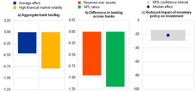 Notes: Panel a): The results are based on data on aggregate EA bank lending to firms since 2003 and a macro-financial structural Bayesian quantile model identified through recursive ordering. The panel illustrates the impact of a one standard deviation shock to US EPU on the peak effect of the shock on euro area loans to non-financial corporations. High financial market volatility indicates levels in the top quintile of realisations of the VSTOXX. Panel b): The results are based on bank-level data since 2007 for a representative sample of 80 euro area banks, and a structural Bayesian VAR model identified through a recursive ordering approach. The panel illustrates the effect of a one standard deviation shock to US EPU on peak differences of the shock on bank loan volumes (annual growth rates) across banks with high and low reserves over assets and non-performing loan ratios. High and low categories refer to the top 40% and bottom 40% of the corresponding indicator. Panel c): The results are based on euro area firm-level data since 2013. The panel illustrates the percentage difference in the impact of a policy rate surprise on firms’ investment following an increase in US EPU faced by euro area firms of one standard deviation from its median. The results are based on panel regression using firm-level data, with time and country fixed effects, using monetary policy surprises from Altavilla et al. (2019) interacted with the uncertainty measure.