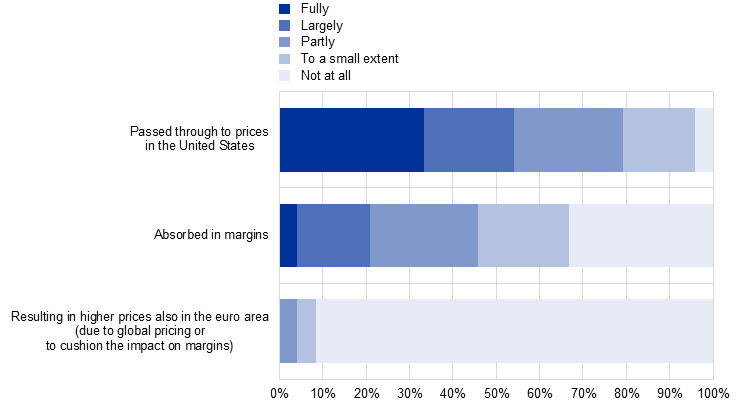 Notes: The chart reflects the interpretation by ECB staff of the responses from a sub-sample consisting of 28 firms exporting to the United States to the question: "To what extent are higher US tariffs (i) being passed through to higher prices in the United States, (ii) being absorbed in margins, (iii) resulting in higher prices also in the euro area (due to global pricing or to cushion the impact on margins)?