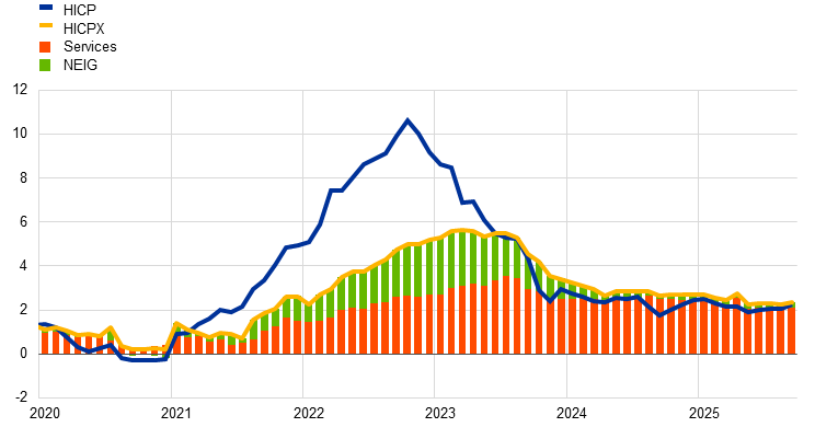 Core inflation in the euro area has declined markedly since its 2023 peak but remains elevated, mainly due to persistent services price inflation. The annual rate of change in the Harmonised Index of Consumer Prices excluding energy and food (HICPX) has fallen substantially, from 5.7% in March 2023 to 2.4% in September 2025. However, it has stayed significantly above headline inflation for more than two years, underscoring its stickiness (Chart A). Within the HICPX, services inflation remains elevated, whereas non-energy industrial goods (NEIG) inflation has already returned to its pre-pandemic average. This box draws on micro price evidence on the frequency of price adjustments to disentangle the roles of sticky and flexible-price items in shaping recent disinflation dynamics in the HICPX.