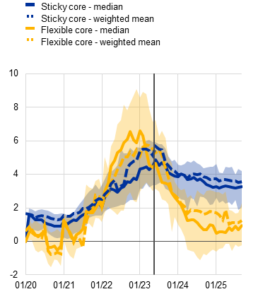 Notes: “Sticky core” includes 39 HICPX items at the COICOP four-digit level and “Flexible core” includes 33. The weighted mean of sticky and flexible core inflation is based on the respective HICP weights. The median is calculated on the basis of the year-on-year inflation rates of all items in each subcategory and shaded areas represent the range of year-on-year rates (25th to 75th percentile). The vertical grey line in panel a) indicates peak HICPX inflation (March 2023). The latest observations are for September 2025.