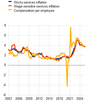 Flexible-price goods drove the surge in NEIG inflation, while the persistence of services inflation reflects contributions from both sticky and flexible-price items (Chart B, panel b). For NEIG, the sharp increase in prices during the period 2021-23 was largely driven by flexible-price items, followed by a rapid decline that brought NEIG inflation back to subdued levels. NEIG inflation is currently relatively stable and moderate and predominantly driven by flexible-price items such as “garments” and “footwear”, while the contributions from sticky-price items are already back at their pre-pandemic average. By contrast, services inflation has remained elevated, reflecting the strong persistence of sticky-price items, whose contributions have declined only marginally since the beginning of this year (from 2.7 to 2.5 percentage points), while the contributions from flexible-price items have fallen more markedly (from 1.2 to 0.7 percentage points).[4] The recent persistence of sticky-price inflation in services is consistent with Martínez Hernández et al. (2025), who found a more gradual pass-through of energy and supply-chain shocks to services than to NEIG inflation. Moreover, upward pressure from labour market shocks associated with strong wage growth has added to that persistence. Sticky services inflation thus co-moves strongly with wage dynamics and wage-sensitive services inflation (Chart C, panel a).
