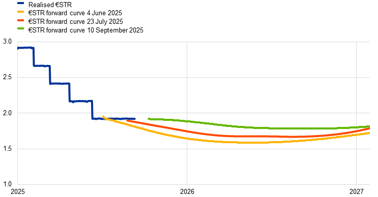 Since the Governing Council’s monetary policy meeting in July 2025 short-term market rates have increased, while longer-term rates have remained broadly unchanged. However, the Governing Council’s past interest rate cuts continued to lower corporate borrowing costs in July. The average interest rate on new loans to firms moved down to 3.5% in July, from 3.6% in June. The cost of issuing market-based debt was unchanged, at 3.5%. Loans to firms grew by 2.8%, slightly more strongly than in June, while the growth of corporate bond issuance rose to 4.1% from 3.4%. The average interest rate on new mortgages was again unchanged at 3.3% in July, while growth in mortgage lending picked up to 2.4%, from 2.2%.