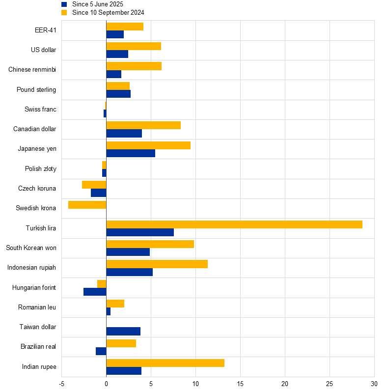 Notes: EER-41 is the nominal effective exchange rate of the euro against the currencies of 41 of the euro area’s most important trading partners. A positive (negative) change corresponds to an appreciation (depreciation) of the euro. All changes have been calculated using the foreign exchange rates prevailing on 10 September 2025.