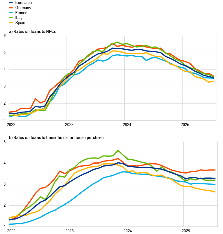 Notes: Composite bank lending rates are calculated by aggregating short and long-term rates using a 24-month moving average of new business volumes. The latest observations are for July 2025. In panel a), NFCs stands for non-financial corporations.