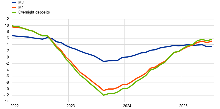Growth in broad money (M3) has slowed since May (Chart 23). Annual M3 growth stood at 3.4% in July, below the 3.9% average observed in the first five months of 2025. Annual growth of narrow money (M1), which comprises the most liquid components of M3, stood at 5.0% in July, a level around which it has been hovering since April. Non-core, volatile items appear to have played an important role in the recent dynamics of M3. From the perspective of individual components, the July data were driven by outflows of deposits held by non-bank financial institutions, partly reflecting heightened volatility. This contrasts with the contribution of households and firms, which remained stable overall. Amid the uncertain environment, both sectors showed a greater preference for liquidity and increased their holdings of overnight deposits accordingly. Moreover, households and firms paused their net withdrawal of time deposits, in line with a possible levelling off in the remuneration of these deposits. From the counterpart perspective, the July data reflect continued volatility in bank lending to firms, net foreign outflows and further volatile, non-structural components.