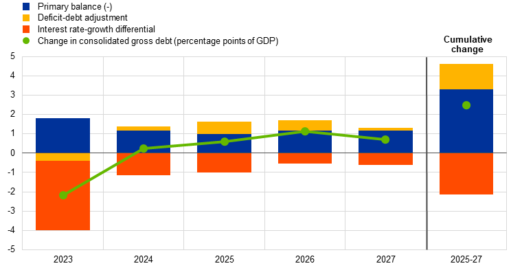 According to the September 2025 ECB staff macroeconomic projections for the euro area, the general government budget deficit, which stood at 3.1% of GDP in 2024, is estimated to decline to 2.9% in 2025 and then increase substantially to 3.4% of GDP in 2027. The euro area fiscal stance is projected to tighten only slightly in 2025, loosen in 2026 and then tighten again, somewhat more strongly, in 2027. The projected loosening in 2026 is mainly on account of higher public investment. The tightening in 2027 reflects primarily lower assumed government spending related to the discontinuation of the grants offered under the Next Generation EU (NGEU) programme. The euro area debt-to-GDP ratio is on an increasing path and projected to reach just under 90% of GDP by 2027, as the continuous primary deficits and positive deficit-debt adjustments more than offset favourable interest rate-growth differentials.