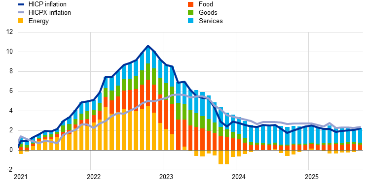 The cut-off date for data included in this issue of the Economic Bulletin was 29 October 2025. According to Eurostat’s flash estimate, released on 31 October, HICP inflation decreased to 2.1% in October 2025, down from 2.2% in September 2025.