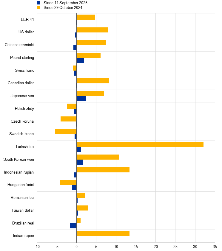 Notes: EER-41 is the nominal effective exchange rate of the euro against the currencies of 41 of the euro area’s most important trading partners. A positive (negative) change corresponds to an appreciation (depreciation) of the euro. All changes have been calculated using the foreign exchange rates prevailing on 29 October 2025.