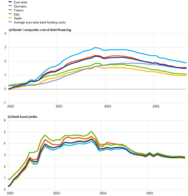 Notes: Composite bank funding costs are an average of new business costs for overnight deposits, deposits redeemable at notice, time deposits, bonds and interbank borrowing, weighted by their respective outstanding amounts. Average bank funding costs use the same weightings but are based on rates for outstanding deposits and interbank funding, and on yield to maturity at issuance for bonds. Bank bond yields are monthly averages for senior tranche bonds. The latest observations are for August 2025 for the composite cost of debt financing for banks (panel a) and 29 October 2025 for bank bond yields (panel b).