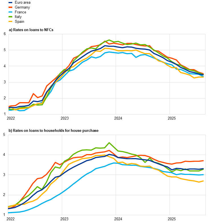 Notes: Composite bank lending rates are calculated by aggregating short and long-term rates using a 24-month moving average of new business volumes. The latest observations are for August 2025. In panel a), NFCs stands for non-financial corporations.