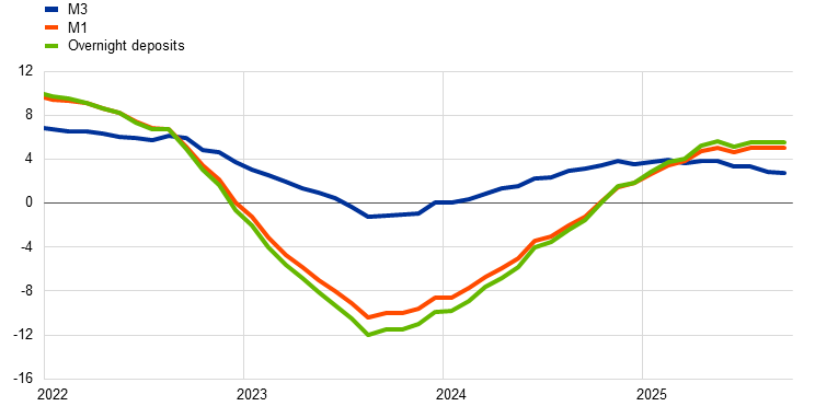 Growth in broad money (M3) continued to weaken in September (Chart 21). Annual M3 growth edged down further in September, to 2.8% from 2.9% in August. It continued the progressive decline seen since February 2025 and remained well below its long-term average of 6.1%. Annual growth of narrow money (M1), which comprises the most liquid components of M3, increased to 5.1% in September, from 5.0% in August. M1 growth continued to be driven by overnight deposits, reflecting a strong preference for liquid assets among firms and households. From a sectoral perspective, the shift in the September data was strongly influenced by non-bank financial institutions, whose money holdings tend to be volatile. From a counterpart perspective, net foreign monetary inflows rebounded strongly in September from the moderate outflows seen in the previous two months. At the same time, the ongoing contraction of the Eurosystem balance sheet continued to weigh on M3 growth.
