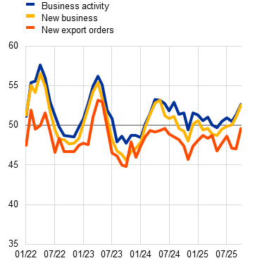 The available data point to persisting weakness in the manufacturing sector in the third quarter, while the services sector is likely to have continued to register positive growth. The composite output Purchasing Managers’ Index (PMI) continued to mark a slight upward trend in September, bringing the average indicator for the third quarter to 51.0. This is consistent with a positive – albeit modest – expansion in euro area economic activity, as higher tariffs, still-heightened uncertainty and a stronger euro negatively affected the manufacturing sector. Industrial production (excluding construction) decreased by 0.3% on average over July and August compared with the second quarter of 2025. The manufacturing output PMI decreased in September, compensating the temporary increase in August, with activity remaining broadly stagnant on average over the third quarter (Chart 4, panel a). The European Commission’s Economic Sentiment Indicator (ESI) for industry was unchanged in September and has been at low levels for many months. The ECB’s recent contacts with non-financial companies confirm this picture of sluggish growth, reporting that the manufacturing sector is being weighed down by tariffs and uncertainty amid sluggish demand, elevated operating costs and increasing global competition (see Box 5). Services sector growth is expected to have remained positive in the third quarter. The recent momentum in services production weakened slightly up to July, but survey data show an upward trend over the third quarter, with the PMI services activity reaching 51.3 in September (Chart 4, panel b). According to the ECB’s recent corporate contacts in the services sector, services activity has been driven by consumer spending on tourism, hospitality, entertainment and telecom services. It has also been boosted by a dynamic digital sector, reflecting the fact that many firms have stepped up efforts to modernise their IT infrastructures and integrate artificial intelligence into their operations.