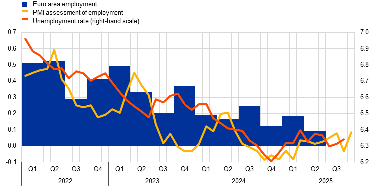 Notes: The two lines indicate monthly developments, while the bars show quarterly data. The PMI is expressed in terms of the deviation from 50, then divided by 10 to gauge quarter-on-quarter employment growth. The latest observations are for the second quarter of 2025 for euro area employment, October 2025 for the PMI assessment of employment and September 2025 for the unemployment rate.