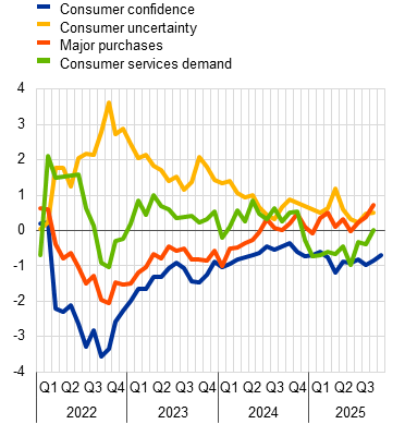 Notes: In panel a), the contributions of domestic goods and services consumption are scaled to add up to the real private consumption growth in the main national accounts. The latest observations are for the second quarter of 2025. In panel b), consumer expectations for major purchases refer to the next 12 months and business expectations for demand in consumer services refer to the next three months. “Consumer services demand” is based on the expected sectoral demand indicators of the European Commission’s business survey of services, weighted according to the sectoral shares in domestic private consumption from the FIGARO input-output tables for 2022. The consumer services demand series is standardised for the period from 2005 to 2019, “consumer uncertainty” is standardised for the period from April 2019 to September 2025 with respect to its average for 2019, owing to data availability, while all other series are standardised for the period from 1999 to 2019. The latest observations are for October 2025 for consumer confidence and September 2025 for all other items.