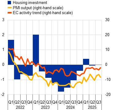 Notes: The lines indicate monthly developments, while the bars refer to quarterly data. The PMIs are expressed in terms of the deviation from 50. In panel a), business investment is measured by non-construction investment excluding Irish intangibles. Short-term indicators refer to the capital goods sector. The European Commission’s capital goods confidence indicator is normalised for the 1999-2019 average and standard deviation of the series. In panel b), the line for the European Commission’s activity trend indicator refers to the weighted average of the building and specialised construction sectors’ assessment of the trend in activity over the preceding three months, rescaled to have the same standard deviation as the PMI. The line for PMI output refers to housing activity. The latest observations are for the second quarter of 2025 for investment and September 2025 for PMI output and the European Commission’s indicators.