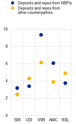 Notes: Panel a and panel c: SIB stands for systemically important banks; UDI stands for universal and diversified institutions, which include universal banks and diversified lenders; IWB stands for investment and wholesale banks; AMC stands for asset managers and custodian banks; RSL stands for retail banks and small lenders.* Panel b: for each significant institution and NBFI entity pair, we calculate the quarterly median for each maturity bucket and currency. Subsequently, we aggregate the results by summing across currencies and maturity buckets. Panel c: volatility is measured as the standard deviation of the share of deposit and repo liabilities divided by banks’ total assets for the period Q1 2016-Q2 2025, by bank business model and counterparty cluster. “Deposits and repos from other counterparties” includes deposits and repos from non-financial corporations, households and banks.