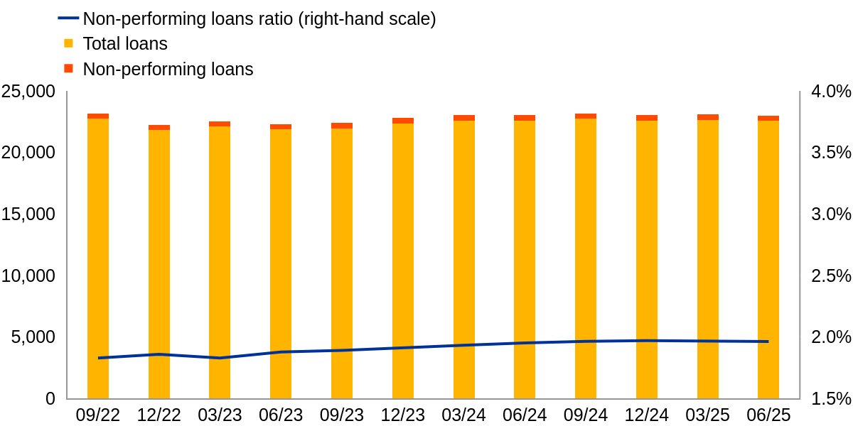 - During the same period, EU credit institutions’ aggregate non-performing loans ratio[1] stayed stable at 1.96% in June 2025, as in June 2024
