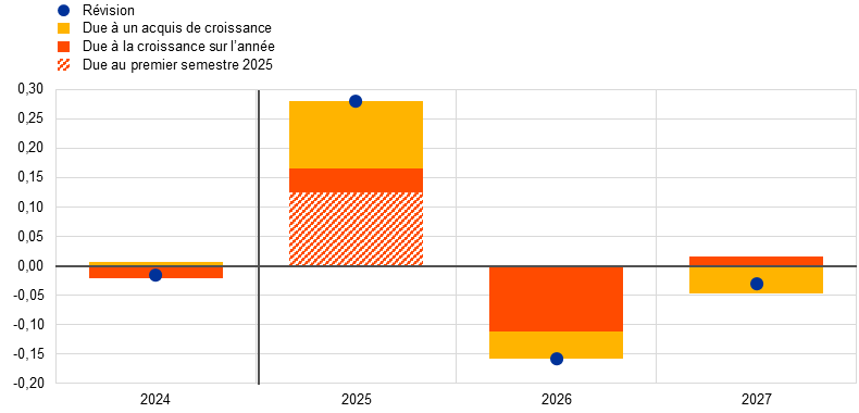 Révisions des projections de la croissance du PIB en volume par rapport aux projections de juin 2025 – décomposition entre acquis de croissance et incidence sur l’année