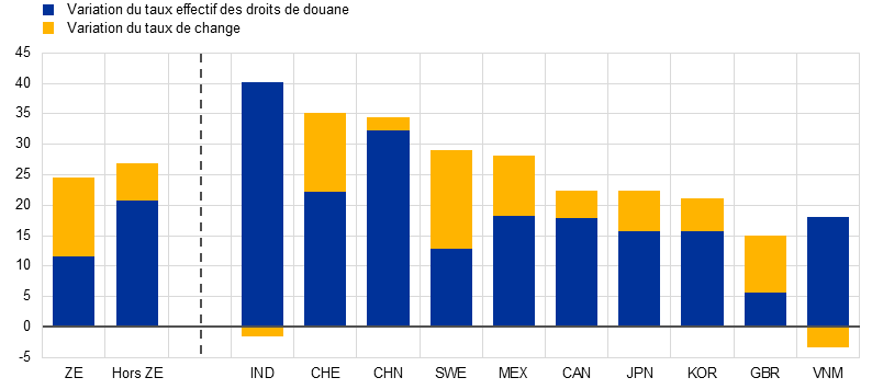 Par rapport aux projections de juin 2025, les taux effectifs des droits de douane appliqués par les États-Unis aux importations de la zone euro et de tous leurs partenaires commerciaux sont plus élevés à la suite de l’accord commercial entre les États-Unis et l’UE et d’autres annonces. Les projections établies par les services de la BCE tiennent compte de ces droits de douane, des pauses et des exemptions en vigueur au moment de la date d’arrêté des projections (28 août) et supposent que ceux-ci resteront au même niveau sur l’ensemble de l’horizon de projection.