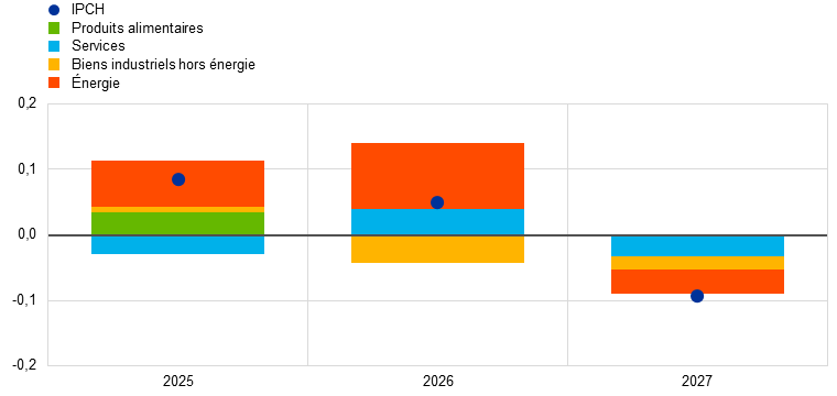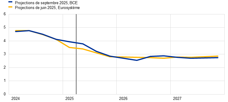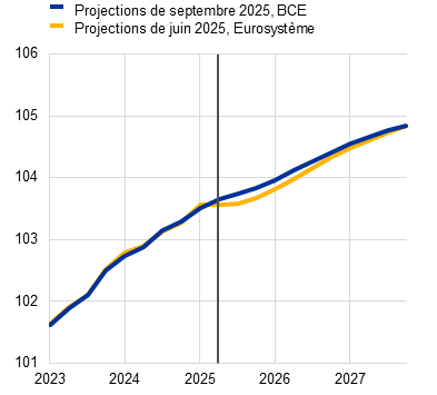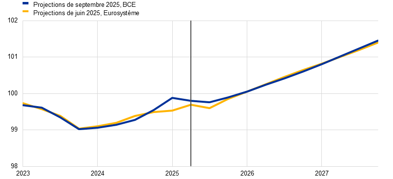 Les perspectives d’inflation sont cohérentes avec une stabilisation de l’inflation autour de l’objectif de 2 % à moyen terme. L’inflation totale, telle que mesurée par l’indice des prix à la consommation harmonisé (IPCH), devrait rester stable, autour de 2 %, pour le reste de 2025, puis diminuer à 1,7 % en 2026 avant de se redresser à 1,9 % en 2027. La baisse en 2026 reflète un nouveau ralentissement progressif des composantes hors énergie, tandis que la hausse des prix de l’énergie devrait rester volatile, mais s’accentuer sur l’horizon de projection, en partie en raison du système d’échange de quotas d’émission de l’UE 2 (SEQE-UE 2), qui démarrera en 2027. L’inflation alimentaire devrait dans un premier temps rester élevée, en raison de la transmission des effets décalés des hausses antérieures des prix des matières premières alimentaires à l’échelle internationale, mais se modérer à des taux légèrement supérieurs à 2 % en 2026 et 2027. L’inflation mesurée par l’IPCH hors énergie et produits alimentaires (IPCHX) devrait ralentir à mesure que les tensions sur les salaires diminuent, que la hausse des prix des services se modère, et que l’appréciation de l’euro se transmet le long de la chaîne des prix et freine le renchérissement des biens. Le ralentissement de la croissance des salaires, les pertes antérieures de salaire réel ayant été compensées, associé à une reprise de la croissance de la productivité, devrait entraîner une nette décélération de la croissance des coûts unitaires de main-d’œuvre. Par rapport aux projections de juin 2025, les perspectives relatives à la hausse de l’IPCH total ont été révisées à la hausse de 0,1 point de pourcentage pour 2025 et 2026 en raison de résultats et d’hypothèses plus élevés concernant les prix des matières premières énergétiques, ainsi que d’effets décalés résultant de l’augmentation des prix des matières premières alimentaires à l’échelle internationale, qui ont plus que compensé l’appréciation de l’euro. Pour 2027, les effets décalés de l’appréciation de l’euro devraient être prédominants, entraînant une révision à la baisse de 0,1 point de pourcentage.