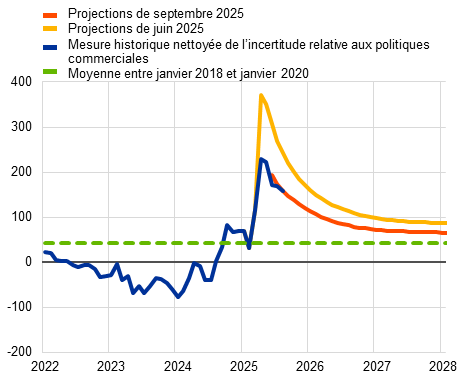 Cela se fonde sur la mesure « non corrigée » de l’incertitude relative aux politiques commerciales, qui est « nettoyée » afin de supprimer l’incidence estimée de l’attention accordée par les médias à l’incertitude non liée aux politiques commerciales, aux taux effectifs des droits de douane, aux conditions financières et aux tensions sur les chaînes d’approvisionnement. Les hypothèses présentées dans le graphique B de l’encadré 2 des projections de juin 2025, intitulé « Droits de douane américains et incertitude relative aux politiques commerciales », faisaient référence à la mesure non corrigée de l’incertitude relative aux politiques commerciales, tandis que le graphique B, partie a) de l’encadré 1 présente la mesure « nettoyée ».