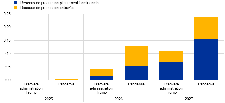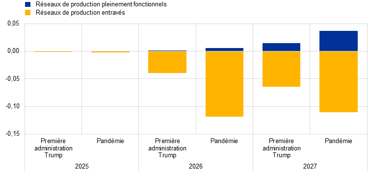 Les effets macroéconomiques sur la zone euro sont minimes dans la première trajectoire différente mais significatifs dans la seconde, avec des perturbations plus extrêmes des chaînes d’approvisionnement, comme pendant la pandémie. Si l’on s’intéresse d’abord aux résultats obtenus avec une économie dotée de réseaux de production pleinement opérationnels, et que l’on utilise le modèle ECB-BASE, dans la trajectoire présentant des goulets d’étranglement au niveau de l’offre similaires à ceux observés durant la première administration Trump, seules des tensions inflationnistes minimes apparaissent, la hausse de l’IPCH progressant de moins de 0,1 point de pourcentage en 2027 (graphique 20, partie b, barres bleues). Le scénario supposant des chocs semblables à ceux qui se sont produits pendant la pandémie donnerait lieu à des effets plus prononcés sur l’inflation, la hausse de l’IPCH pouvant atteindre 0,15 point de pourcentage de plus en 2027 (graphique 20, partie b, barres bleues). Dans les deux analyses de sensibilité, l’incidence sur le PIB en volume est négligeable ou légèrement positive, reflétant l’hypothèse de taux d’intérêt inchangés qui, compte tenu de l’inflation plus élevée, implique une baisse des taux d’intérêt réels qui stimulerait l’activité (graphique 20, partie a, barres bleues). L’analyse est étendue à l’aide d’un modèle multi-pays et multi-sectoriel qui tient compte des liens entrées-sorties, l’enrayement des réseaux de production d’autres régions venant s’ajouter aux blocages des chaînes d’approvisionnement. Cette hypothèse réduit la substituabilité au sein des chaînes de production et se traduirait par des effets plus prononcés (graphique 20, barres jaunes). Dans ce cas, par rapport au scénario de référence, l’inflation en 2027 pourrait être jusqu’à 0,1 point de pourcentage plus élevée dans le scénario relatif à la première administration Trump et près de 0,25 point de pourcentage plus forte dans le scénario plus extrême relatif à la pandémie, tandis que la croissance du PIB serait légèrement ralentie[19].