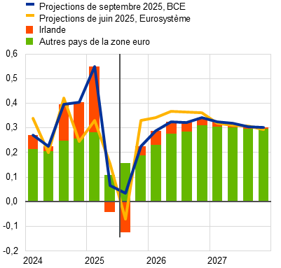 Par rapport aux projections de juin 2025, la croissance projetée du PIB en volume a été révisée à la hausse pour 2025, de 0,3 point de pourcentage, et à la baisse, de 0,1 point de pourcentage pour 2026, mais reste inchangée pour 2027. Le relèvement de la projection pour 2025 reflète un acquis de croissance positif lié aux révisions de données historiques, des statistiques effectives bien meilleures que prévu pour le premier trimestre 2025, et de tout récents indicateurs qui laissent présager une légère révision à la hausse de la croissance au troisième trimestre (graphique 3). La légère hausse des droits de douane, l’affaiblissement de la demande extérieure et la détérioration de la compétitivité-prix liée à l’appréciation de l’euro ont plus que compensé les effets de l’amélioration de la confiance sur l’activité, entraînant une révision à la baisse de 0,1 point de pourcentage des perspectives de croissance pour 2026. La projection pour 2027 reste inchangée. S’agissant des composantes de la dépense (graphique 2, partie b), les révisions les plus importantes pour 2025 se rapportent à l’investissement (plus de la moitié d’entre elles étant imputables à la volatilité des investissements dans les droits de propriété intellectuelle en Irlande) et aux exportations nettes.