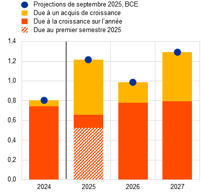 Les droits de douane et l’incertitude qui y est associée ont contribué à de fortes fluctuations de l’activité économique au premier semestre 2025, avec une anticipation de l’activité, en particulier en Irlande. La dissipation de ces facteurs au second semestre de l’année devrait entraîner de nouveaux épisodes de volatilité et brouiller les signaux relatifs à la dynamique sous-jacente de l’économie de la zone euro. Abstraction faite de la volatilité provoquée par les fluctuations des données irlandaises, la croissance économique dans le reste de la zone euro était en fait plus stable, et devrait le rester au second semestre 2025. Si le nouvel accord commercial conclu entre les États-Unis et l’Union européenne (UE) suppose une augmentation des droits de douane sur les exportations de la zone euro aux États-Unis, il a contribué à réduire l’incertitude quant aux politiques commerciales. Plus tard sur l’horizon de projection, la croissance économique de la zone euro devrait se renforcer, soutenue par plusieurs facteurs. La hausse des salaires réels et de l’emploi, conjuguée à de nouvelles dépenses publiques en matière d’infrastructures et de défense, principalement en Allemagne, devrait stimuler la demande intérieure dans la zone euro. En outre, des conditions de financement moins restrictives, reflétant essentiellement les récentes décisions de politique monétaire, et un rebond de la demande extérieure en 2027 soutiendraient également les perspectives de croissance. La croissance annuelle moyenne du PIB en volume devrait s’établir à 1,2 % en 2025, 1,0 % en 2026 et 1,3 % en 2027. Par rapport aux projections macroéconomiques de juin 2025 établies par les services de l’Eurosystème, les perspectives de croissance du PIB ont été révisées à la hausse de 0,3 point de pourcentage pour 2025, traduisant des données meilleures qu’anticipé ainsi qu’un acquis de croissance résultant des révisions des données historiques. Étant donné que les surprises s’agissant des données ne sont pas toutes liées à une anticipation de l’activité plus importante que prévu, elles ne devraient être que partiellement compensées au second semestre de l’année. L’appréciation de l’euro et l’affaiblissement de la demande extérieure (du fait notamment de droits de douane légèrement plus élevés qu’anticipé dans les projections de juin) ont entraîné une révision à la baisse de 0,1 point de pourcentage pour 2026. La projection pour 2027 reste inchangée[1].
