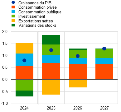 La croissance du PIB en volume devrait continuer d’être tirée par la consommation privée. Du point de vue des dépenses (graphique 2, partie a), la consommation privée progresserait nettement sur l’ensemble de l’horizon, apportant la contribution la plus importante à la croissance du PIB en volume. En outre, la consommation publique et l’investissement total augmenteraient chaque année de 2025 à 2027, l’investissement privé venant compenser le fort effet de falaise attendu sur l’investissement public en 2027 à la suite de l’expiration des subventions accordées au titre du programme NGEU. Les exportations nettes devraient à l’inverse apporter des contributions négatives à la croissance du PIB en volume en 2025 et 2026, la contribution des importations (-1,2 point de pourcentage et ‑0,9 point de pourcentage respectivement) excédant celle des exportations (0,6 point de pourcentage et 0,5 point de pourcentage respectivement) ; cet effet est toutefois partiellement compensé par une contribution positive des variations de stocks en 2025 (graphique 2, partie b). La forte volatilité des variations de stocks tout au long de 2025 est liée à la constitution de stocks et au déstockage, dans le contexte des effets d’anticipation et de leur dissipation progressive.
