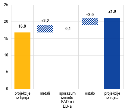 - Ukupna efektivna carinska stopa SAD‑a na uvoz robe svih trgovinskih partnera povećala se sa 16,8 %, koliko je predviđeno u projekcijama iz lipnja, na 21,0 % (Grafikon A, dio b)). To je posljedica udvostručenja univerzalnih carina na čelik i aluminij (s 25 % u projekcijama iz lipnja 2025. na 50 %), dodavanja 407 derivata čelika i aluminija na popis proizvoda koji podliježu carinama, novih univerzalnih carina na bakar (50 %), bilateralnih trgovinskih sporazuma sklopljenih s ključnim trgovinskim partnerima (npr. s Europskom unijom, Japanom, Korejom i Vijetnamom), viših recipročnih stopa koje su stupile na snagu 7. kolovoza za države s kojima nije postignut trgovinski sporazum (npr. Indiju i Švicarsku), povećanja carina na brazilski izvoz (na 50 %) i kanadski izvoz (povećanje carinske stope na 35 % za robu koja nije u skladu sa sporazumom između SAD‑a, Kanade i Meksika) i sekundarnih carina primjenjivih na Indiju (dodatnih 25 postotnih bodova) kako bi se sankcionirala indijska kupnja ruske nafte.