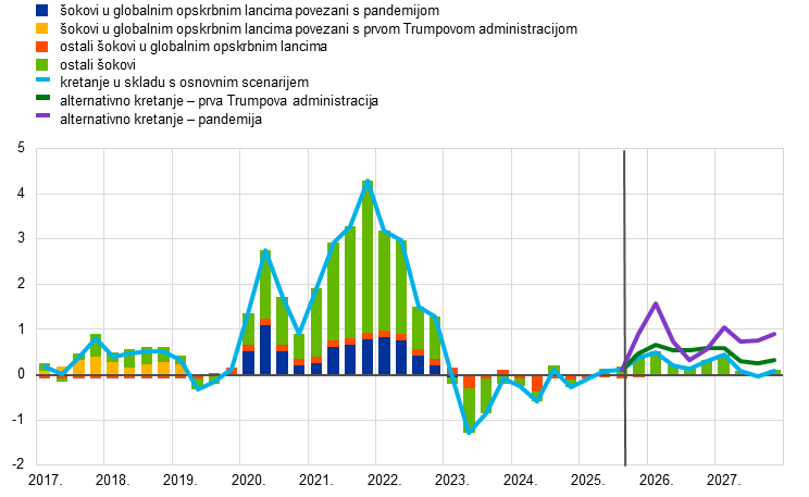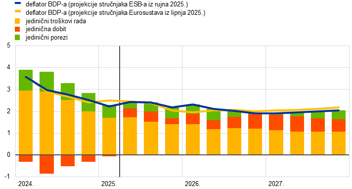 Inflacijski izgledi u skladu su sa stabiliziranjem inflacije na razinama oko srednjoročnog cilja od 2 %. Predviđa se da će ukupna inflacija mjerena harmoniziranim indeksom potrošačkih cijena (HIPC) uglavnom ostati nepromijenjena i iznositi oko 2 % u preostalom dijelu 2025. te da će se potom smanjiti na 1,7 % u 2026. i porasti na 1,9 % u 2027. Smanjenje u 2026. upućuje na daljnje postupno smanjenje komponenata inflacije bez energije. Inflacija cijena energije trebala bi pak i nadalje biti kolebljiva, ali porasti tijekom projekcijskog razdoblja, djelomično zbog uvođenja sustava EU‑a za trgovanje emisijama (ETS2) u 2027. Očekuje se da će inflacija cijena hrane u početku ostati povišena zbog prijenosa odgođenih učinaka prošlih povećanja međunarodnih cijena prehrambenih sirovina, ali da će se u 2026. i 2027. smanjiti na razine malo više od 2 %. Inflacija mjerena HIPC‑om bez energije i hrane trebala bi se smanjiti kako budu popuštali pritisci plaća i smanjivala se inflacija cijena usluga te kako se aprecijacija eura bude prenosila kroz cjenovni lanac i ograničavala inflaciju cijena dobara. Očekuje se da će manji rast plaća, kao posljedica nadoknađivanja prošlog pada realnih plaća, zajedno s oporavkom rasta produktivnosti znatno usporiti rast jediničnih troškova rada. U odnosu na projekcije iz lipnja 2025. izgledi za ukupnu inflaciju mjerenu HIPC‑om revidirani su naviše za 0,1 postotni bod za 2025. i 2026. zbog viših stvarnih i pretpostavljenih cijena energenata te zbog odgođenih učinaka viših međunarodnih cijena prehrambenih sirovina, koji više nego neutraliziraju aprecijaciju eura. Kada je riječ o 2027., predviđa se da će prevladavati odgođeni učinci aprecijacije eura, zbog čega je došlo do revizije naniže za 0,1 postotni bod.