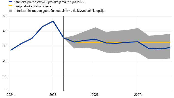 Napomene: Revizije su prikazane kao postotci za razine, kao postotni bodovi za stope rasta te kao postotci na godišnjoj razini. Za revizije stopa rasta i kamatnih stopa rabe se brojevi zaokruženi na jednu decimalu, dok se za revizije iskazane kao promjene u postotcima rabe nezaokruženi brojevi. Tehničke pretpostavke povezane s kamatnim stopama i cijenama sirovina u europodručju temelje se na tržišnim očekivanjima s krajnjim datumom 15. kolovoza 2025. Cijene nafte odnose se na promptne i terminske cijene sirove nafte Brent. Cijene plina odnose se na promptne i terminske cijene plina na nizozemskoj platformi za trgovinu plinom Title Transfer Facility (TTF). Cijene električne energije odnose se na prosječnu veleprodajnu promptnu i terminsku cijenu u pet najvećih država europodručja. »Sintetička« terminska cijena emisijskih jedinica u sustavu ETS1 izvodi se linearnom interpolacijom kao vrijednost dviju najbližih ročnica emisijskih jedinica na europskoj burzi energije (engl. European Energy Exchange) na kraju mjeseca. Potom se izračunava prosjek mjesečnih cijena ročnica emisijskih jedinica kako bi se dobio godišnji ekvivalent. Budući da se još nije znatnije trgovalo emisijskim jedinicama u sustavu ETS2, stručnjaci Eurosustava pretpostavili su cijenu na razini praga iznad koje će se osloboditi dodatne emisijske jedinice, pri čemu je cijena prilagođena cijenama u 2027. (više pojedinosti može se pronaći u okviru Procjena utjecaja politika tranzicije povezanih s klimatskim promjenama na rast i inflaciju u Makroekonomskim projekcijama stručnjaka Eurosustava za europodručje iz prosinca 2024.). Kretanja cijena sirovina izvedena su iz kretanja na tržištima ročnica u deset radnih dana koji su prethodili krajnjem datumu. Pretpostavlja se da će bilateralni tečajevi tijekom projekcijskog razdoblja ostati nepromijenjeni na prosječnim razinama zabilježenima tijekom deset radnih dana koji su prethodili krajnjem datumu. Pretpostavke povezane s nominalnim prinosima na desetogodišnje državne obveznice u europodručju temelje se na prosječnom prinosu desetogodišnjih obveznica država, koji je ponderiran godišnjim BDP‑om. Ako postoje potrebni podatci, nominalni prinosi na desetogodišnje državne obveznice tih država definiraju se kao prinosi desetogodišnjih referentnih obveznica produljeni terminskim nominalnim prinosima koji su na krajnji datum izvedeni iz odgovarajućih krivulja prinosa za pojedinačne države. Za preostale države prinosi na desetogodišnje državne obveznice definirani su kao prinosi desetogodišnjih referentnih obveznica produljeni na osnovi konstantne razlike (zabilježene na krajnji datum) u odnosu na tehničku pretpostavku o nerizičnim dugoročnim kamatnim stopama u europodručju.
