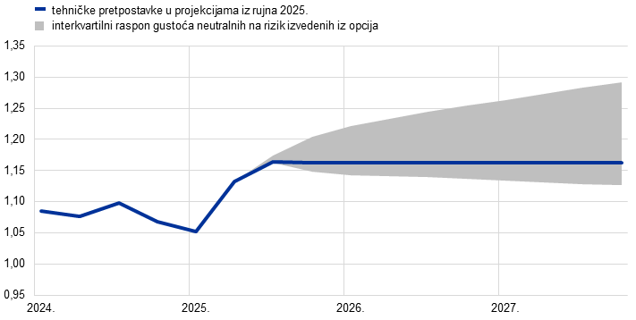 Ovom analizom osjetljivosti procjenjuju se posljedice alternativnih kretanja tečaja koje upućuju na mogućnost daljnjeg pritiska na rast eura i posljedične negativne rizike za rast i inflaciju. Tehničke pretpostavke o tečajevima iz osnovnih projekcija smatraju se nepromijenjenima tijekom projekcijskog razdoblja. Alternativna niža i viša kretanja proizlaze iz 25. i 75. percentila gustoća neutralnih na rizik izvedenih iz opcija za tečaj USD/EUR na dan 15. kolovoza 2025., pri čemu taj raspon upućuje na aprecijaciju eura (Grafikon 16.). Utjecaji alternativnih kretanja procjenjuju se makroekonomskim modelima stručnjaka ESB‑a i Eurosustava. Prosječni utjecaj na rast proizvodnje i inflaciju prema tim modelima prikazan je u Tablici 7.
