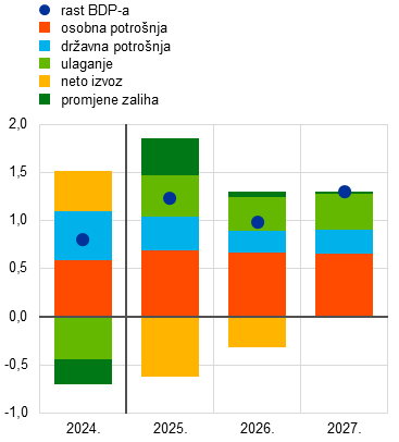 Rast realnog BDP‑a i dalje bi trebala poticati osobna potrošnja. Kada je riječ o rashodima (Grafikon 2., dio a)), u cijelom projekcijskom razdoblju predviđa se snažan rast osobne potrošnje, koja će dati najveći doprinos rastu realnog BDP‑a. Osim toga, državna potrošnja i ukupno ulaganje trebali bi se povećavati svake godine u razdoblju od 2025. do 2027., pri čemu bi privatna ulaganja trebala neutralizirati očekivani snažni učinak litice na području javnog ulaganja u 2027. kao posljedice prestanka financiranja bespovratnim sredstvima iz instrumenta NGEU. S druge strane, predviđa se da će doprinos neto izvoza rastu realnog BDP‑a u 2025. i 2026. biti negativan, pri čemu će doprinos uvoza (–1,2 postotna boda u 2025. i –0,9 postotnih bodova u 2026.) premašiti doprinos izvoza (0,6 postotnih bodova u 2025. i 0,5 postotnih bodova u 2026.), ali da će ga djelomično neutralizirati pozitivni doprinos promjena zaliha u 2025. (Grafikon 2., dio b)). Vrlo kolebljive promjene zaliha tijekom 2025. povezane su s gomilanjem i smanjivanjem zaliha zbog učinaka ubrzanja aktivnosti i potom njihova slabljenja.