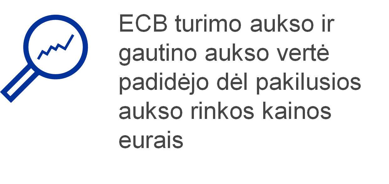 ECB turimo aukso ir gautino aukso vertė eurais 2021 m. padidėjo 1,1 mlrd. eurų – iki 26,1 mlrd. eurų (4 pav.) – dėl padidėjusios aukso rinkos kainos eurais, tačiau aukso kiekis uncijomis nepakito. Dėl šio padidėjimo atitinkama suma išaugo ir ECB aukso perkainojimo sąskaitos (žr. 1.3.2 skirsnį Finansiniai ištekliai).