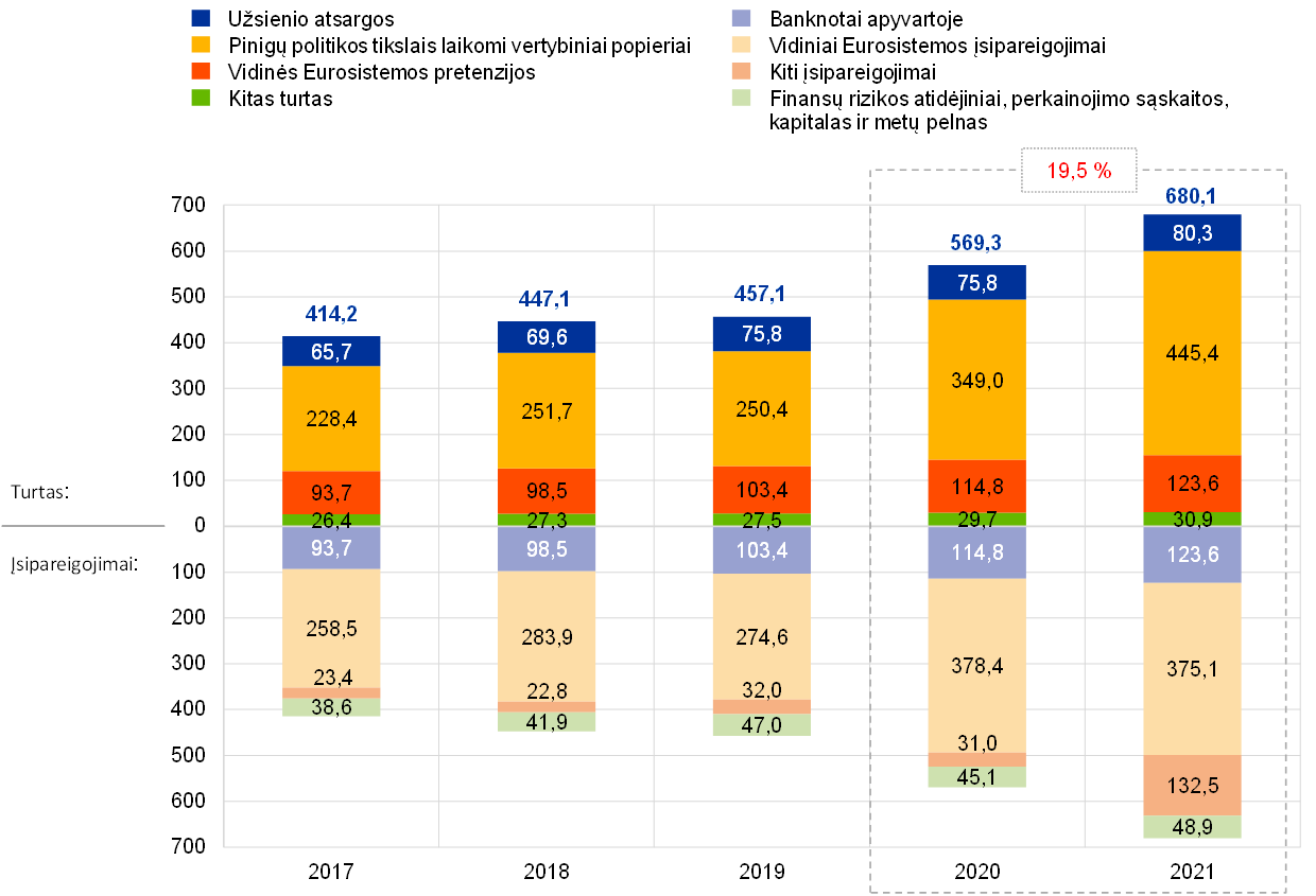 2021 m. ECB balansas padidėjo 110,8 mlrd. – iki 680,1 mlrd. eurų, daugiausia dėl pagal SPPP ir TPP įsigytų vertybinių popierių. Dėl šių pirkimų balanso straipsnio Pinigų politikais tikslais laikomi vertybiniai popieriai suma padidėjo, o dėl piniginių atsiskaitymų už minėtus pirkimus per TARGET2 sąskaitas atitinkamai padidėjo straipsnio Vidiniai Eurosistemos įsipareigojimai suma. Šį vidinių Eurosistemos įsipareigojimų padidėjimą su kaupu atsvėrė iš ne euro zonos ECB klientų TARGET2 gautų piniginių lėšų poveikis, dėl kurio padidėjo ir kiti įsipareigojimai.