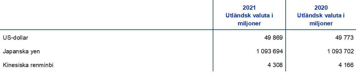 - Dessa innehav omfattar tillgångar i ”Fordringar i utländsk valuta på hemmahörande utanför euroområdet – Banktillgodohavanden och värdepapper, lån och andra tillgångar, och ”Fordringar i utländsk valuta på hemmahörande i euroområdet”.