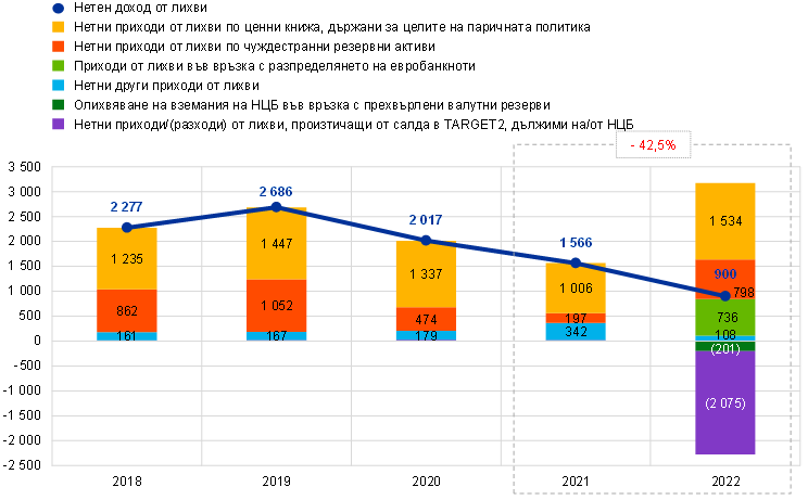 Нетният доход от лихви на ЕЦБ намаля с 666 млн. евро на 900 млн. евро (Графика 14), главно вследствие на разходи за лихви, произтичащи от нетното задължение на ЕЦБ в TARGET2. За спада допринесоха също разходите за лихви, свързани с олихвяването на вземанията на НЦБ от еврозоната във връзка с прехвърлени на ЕЦБ валутни резерви. Тези разходи бяха частично компенсирани от по-високи приходи от лихви, произтичащи от i) вземанията на ЕЦБ във връзка с разпределянето на евробанкноти в рамките на Евросистемата, ii) чуждестранни резервни активи и iii) ценни книжа, държани за целите на паричната политика.