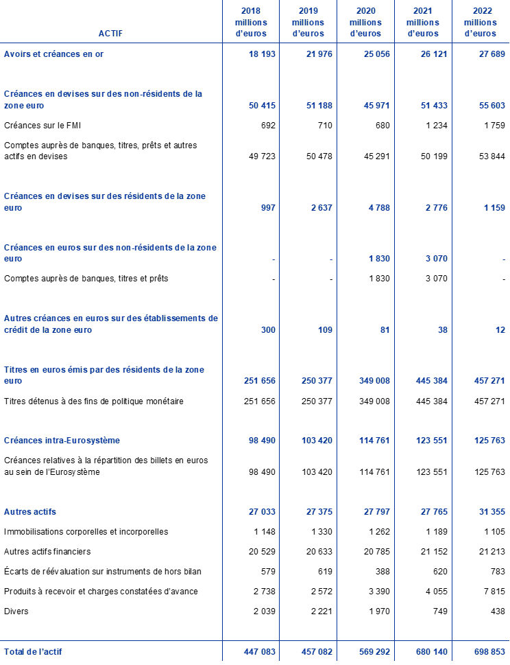 En 2022, la taille du bilan de la BCE s’est accrue de 18,7 milliards d’euros, à 698,9 milliards d’euros, du fait essentiellement de la part de la BCE dans les achats de titres effectués dans le cadre du PEPP et de l’APP. Ces achats se sont traduits par une hausse des titres détenus à des fins de politique monétaire, alors que leur règlement en espèces à travers les comptes TARGET2 a entraîné une augmentation correspondante des engagements intra-Eurosystème. Cette augmentation des engagements intra-Eurosystème a été plus que compensée par les flux de trésorerie résultant de la hausse des dépôts des résidents de la zone euro auprès de la BCE, qui a simultanément entraîné une hausse des autres engagements.