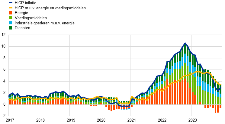 In 2023 heeft de ECB verder vooruitgang geboekt in de strijd tegen de inflatie in het eurogebied. Het jaar begon met een totale inflatie die nog in de buurt van recordhoogtes lag. De negatieve effecten van eerdere aanbod- en vraagschokken namen weliswaar af, maar dreven nog steeds de prijzen op. Twee belangrijke ontwikkelingen hebben echter de weg geëffend voor een scherpe daling van de inflatie in de loop van het jaar.