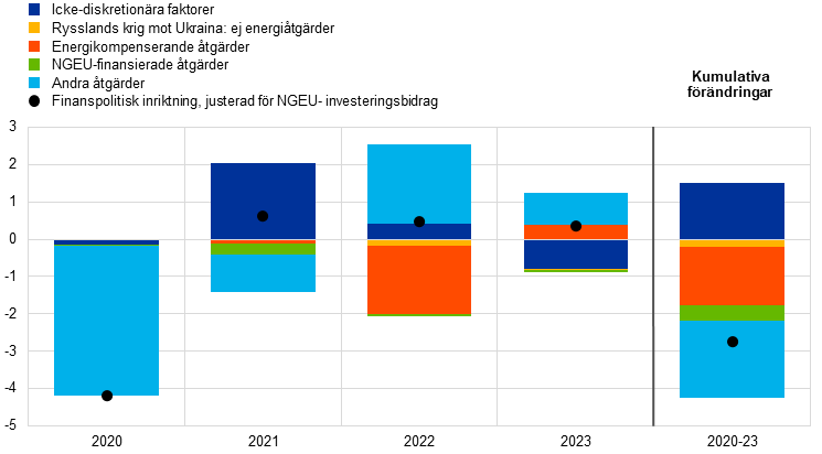 Anm.: Från och med 2021 justeras måttet för den finanspolitiska inriktningen på intäktssidan genom att bidrag från NGEU-programmets facilitet för återhämtning och resiliens tas bort eftersom dessa intäkter inte har några makroekonomiska åtstramande effekter. ”Övriga åtgärder” gäller främst åtgärder som införts under pandemin och därefter avvecklats.