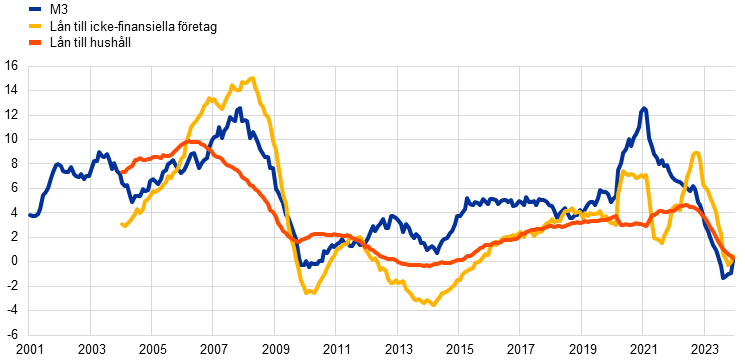 I euroområdet försvagades den ekonomiska tillväxten under 2023. Det var framför allt industrisektorn som drabbades av stramare finansieringsförhållanden, höga insatskostnader och svag global efterfrågan, medan tjänstesektorn inledningsvis alltjämt fick stöd från kvardröjande effekter av ekonomins återöppnande efter pandemin. Medan ECB:s räntehöjningar fick ett kraftfullt genomslag i den ekonomiska aktiviteten var arbetsmarknaden fortsatt ganska motståndskraftig. Regeringarna i euroområdet fortsatte att avveckla de stödåtgärder som vidtagits som respons på pandemin och energipris- och inflationschockerna och drog tillbaka en del av sina tidigare finanspolitiska lättnader. Inflationen föll kraftigt i euroområdet, vilket framför allt berodde på att energiinflationen sjönk till negativt territorium när 2022 års kraftiga energiprisuppgångar försvann. Den underliggande inflationen började också avta, vilket understödde en generell inflationsnedgång och återspeglade den avtagande påverkan från tidigare chocker samt ökande effekter av den stramare penningpolitiken. Det inhemska pristrycket ersatte dock det externa trycket som främsta inflationsdrivande kraft då utvecklingen på arbetsmarknaden medförde en stark tillväxt i de nominella löner, med arbetstagare som ville få kompensation för den köpkraft de förlorat till följd av inflationen.