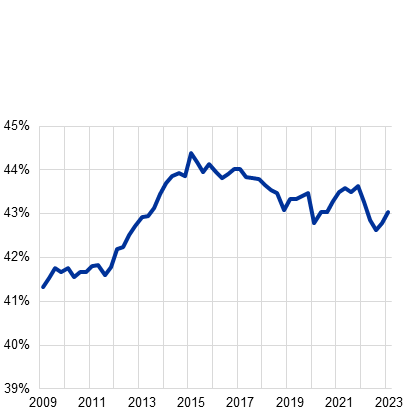 Under 2023 höjde ECB styrräntorna med ytterligare 200 punkter, vilket resulterade i att räntan på inlåningsfaciliteten var 4 procent. Den åtstramade penningpolitiken fick ett kraftfullt genomslag i ekonomin. | Kärnprimärkapitalrelationen för bankerna i euroområdet var 15,6 procent under det tredje kvartalet. Detta var nära den högsta nivån sedan den europeiska banktillsynen inleddes och återspeglade högre lönsamhet och riskreducering i bankportföljerna. |