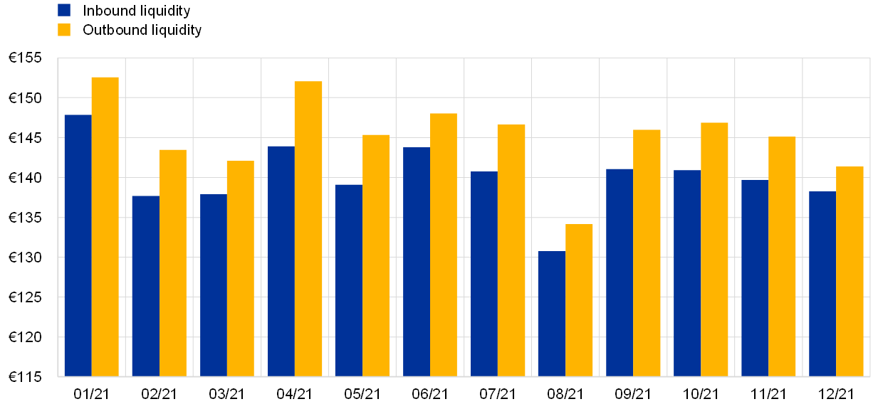 In 2021 settlement efficiency at end of day reached on average 94.34% in volume terms and 94.07% in value terms. This is in line with the 2020 calculations, when settlement efficiency at end of day averaged 94.51% in volume terms and 94.35% in value terms. In 2021 settlement efficiency in volume terms ranged between 93.18% and 94.79%, as illustrated in Chart 11. In value terms, it displayed more volatility, ranging between 92.78% and 96.20%. The minimum level was reached in December and the maximum level was reached in August, in both volume and value terms. During the fourth quarter of 2021 T2S recorded a significant increase in both the volume and the value of on-hold transactions, mainly owing to external reasons, such as volatility on financial markets. This, combined with the lower traffic typically seen in the month of December, negatively affected settlement efficiency. In this period the average settlement efficiency at end of day stood at 93.83% in volume terms and 93.31% in value terms.