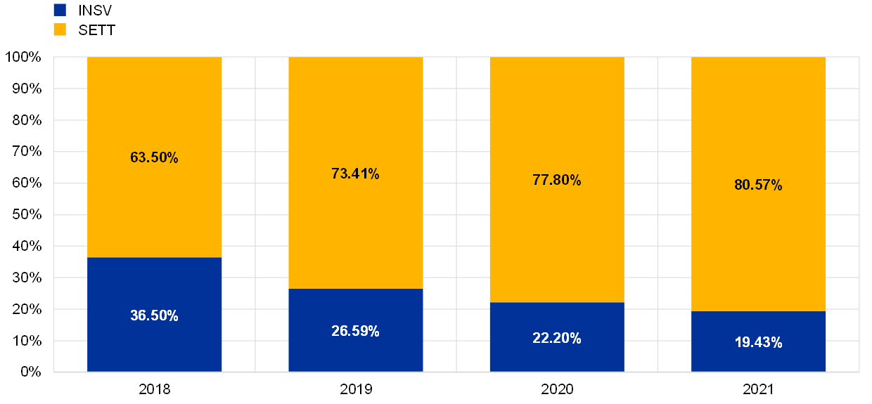 The analysis of settlement efficiency topics continued in 2021. A fifth dedicated Market Settlement Efficiency (MSE) workshop was organised in June. The main purpose was to improve on the calculation of the settlement efficiency indicator computed in accordance with the CSDR guidelines prepared for the fourth workshop, to support the CSDs in their preparation for the new regulatory framework. The enhancements encompassed aligning the treatment of partially settled transactions[6] with CSDR requirements and including late matching transactions (LMT)[7] in additional breakdowns compared with the fourth workshop. The indicators were provided at the global level, as well as by time of day, type of settlement instruction and type of asset. Moreover, a set of intraday settlement efficiency indicators was developed following contacts with the market.