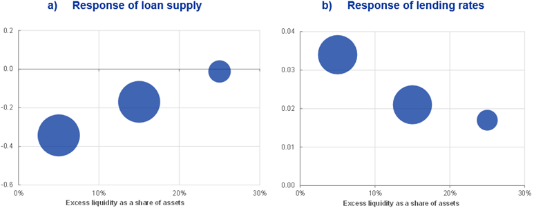 (percentage points of supply-driven loan growth (panel a) and change in lending rates (panel b) over three months for each percentage point increase in the deposit facility rate; size of bubbles equal to volumes of loans to firms)